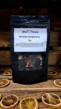 Herbata świąteczna Czarna liściasta z dodatkami żurawiny papai jabłka skórek pomarańczy rodzynek czekolady 50g herbaty